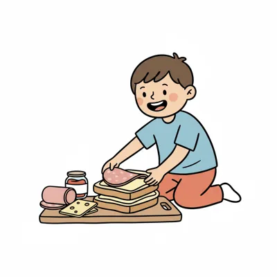 Ein fröhlicher Junge bereitet Sandwiches mit Wurst und Käse auf einem Schneidebrett zu.