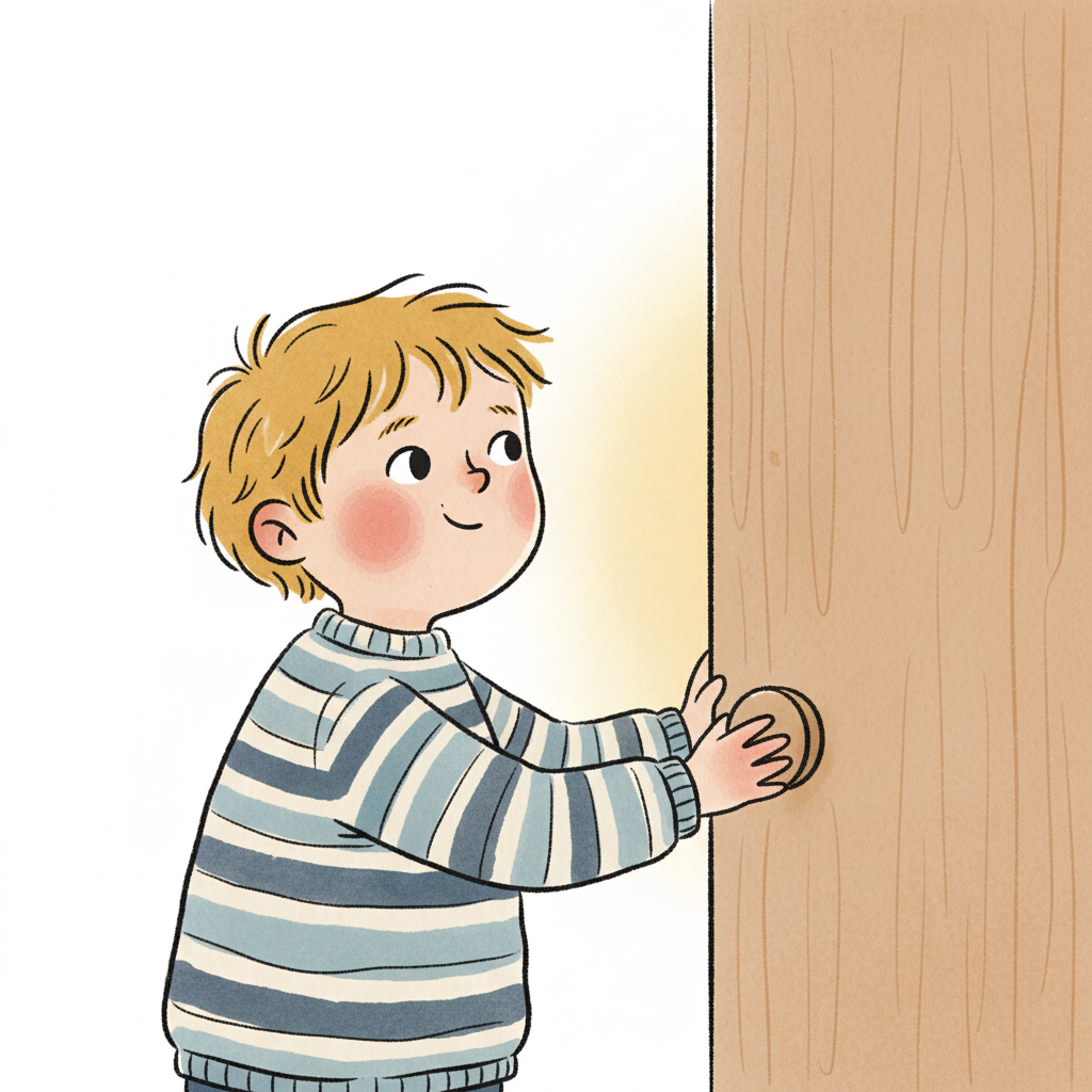 Ein fröhlicher Junge steht vor einer Tür und schaut neugierig.
