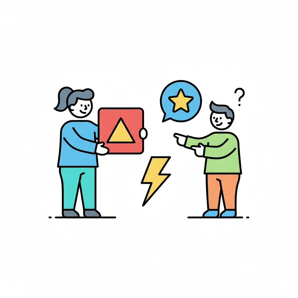 Zwei Personen interagieren: Eine präsentiert ein Dreieck, die andere hat eine Frage und eine Idee.