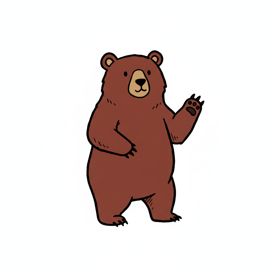 Ein brauner Cartoon-Bär steht aufrecht und winkt mit einer Pfote.