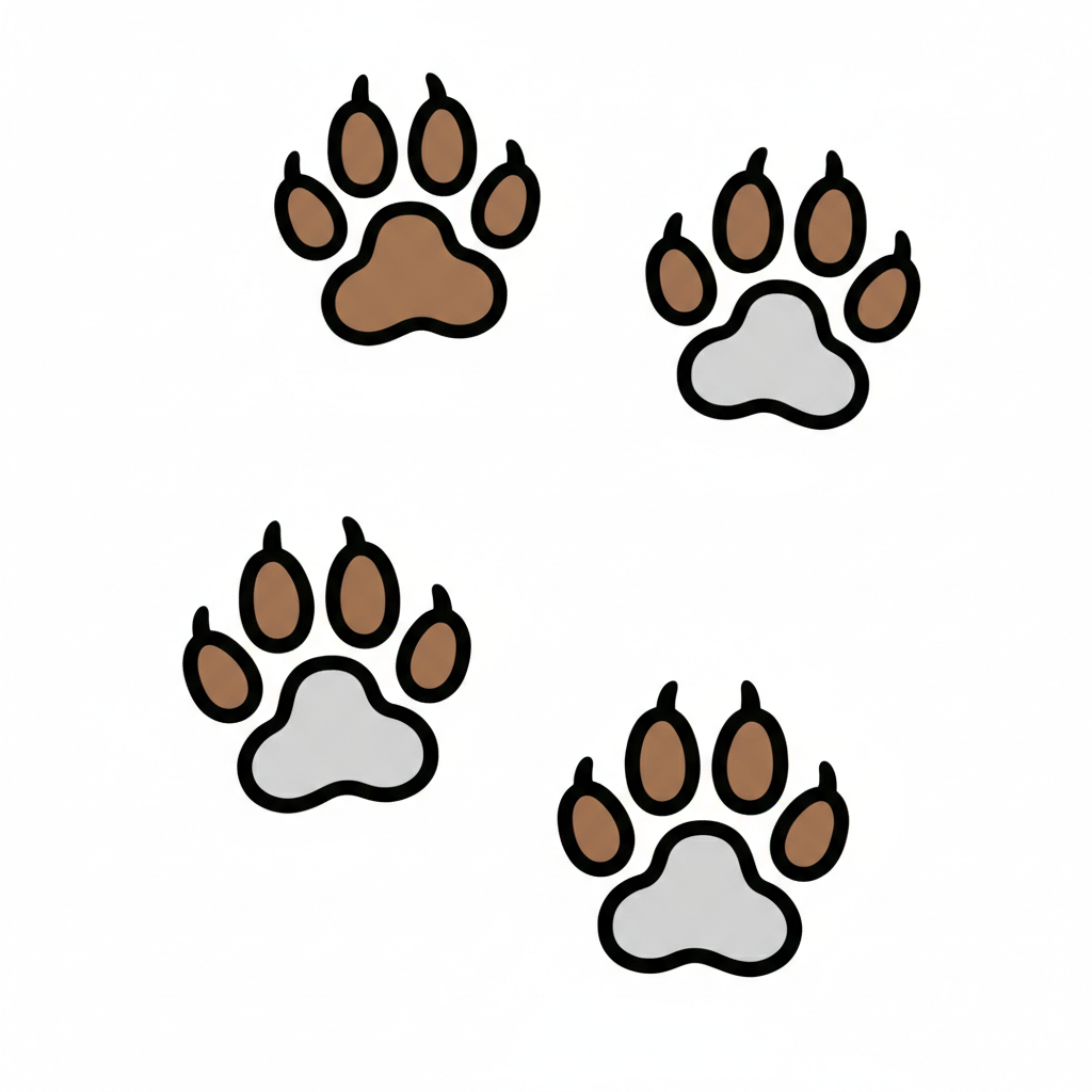 Vier stilisierte Pfotenabdrücke, drei mit grauen Ballen, einer mit braunem Ballen.