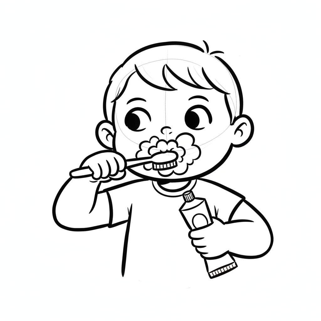 Junge putzt Zähne mit Zahnbürste und Zahnpasta, fröhlich und entspannt.