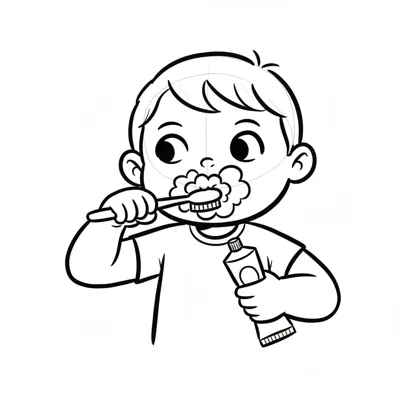 Ein Kind putzt sich die Zähne, hält Zahnbürste und Zahnpasta. Schwarz-Weiß-Illustration.