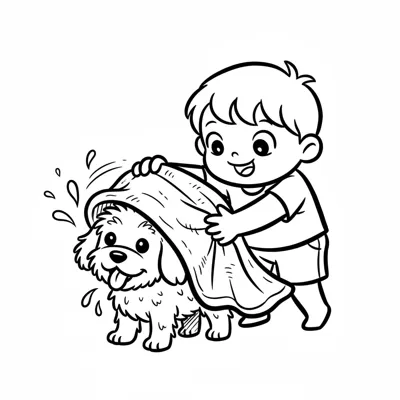 Ein Junge deckt einen Hund mit einem Handtuch zu und lacht.