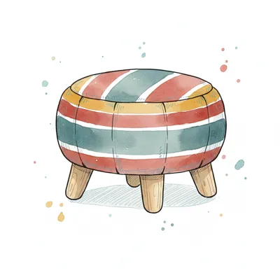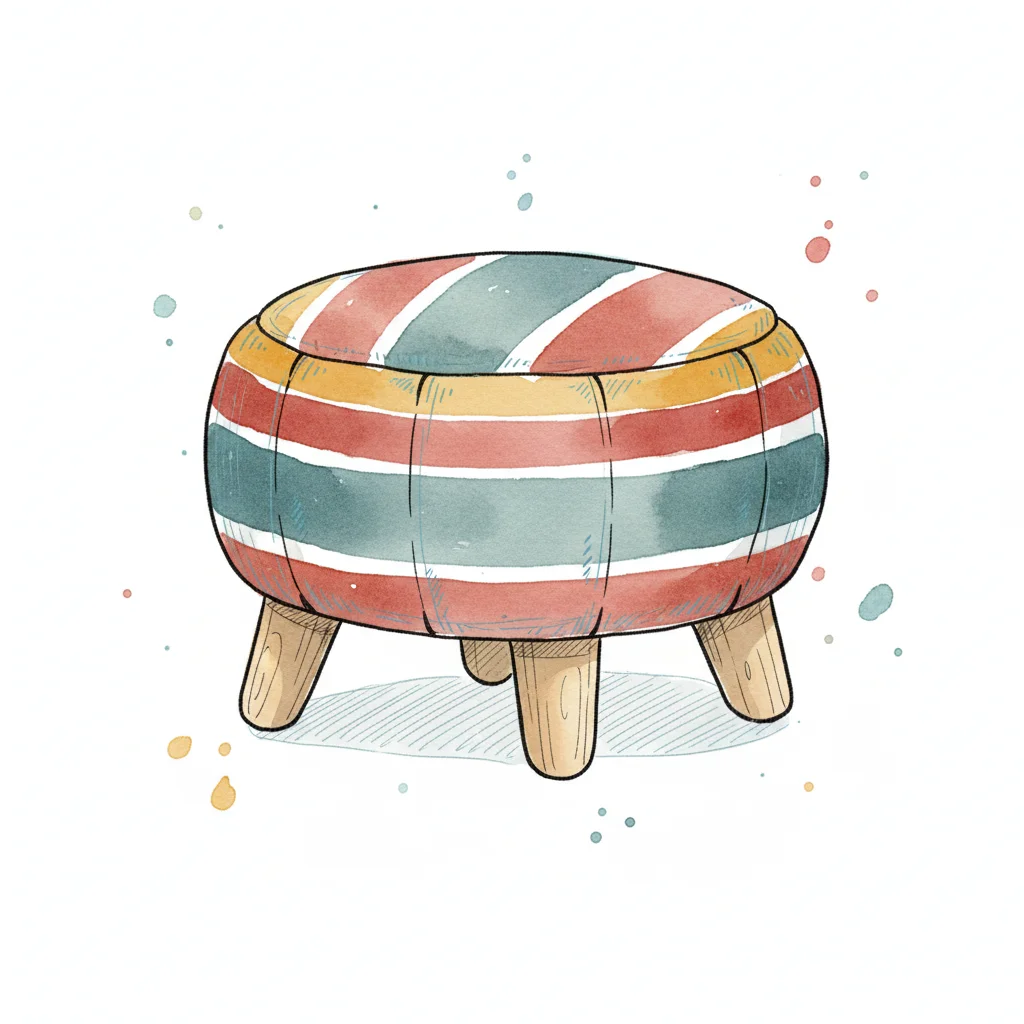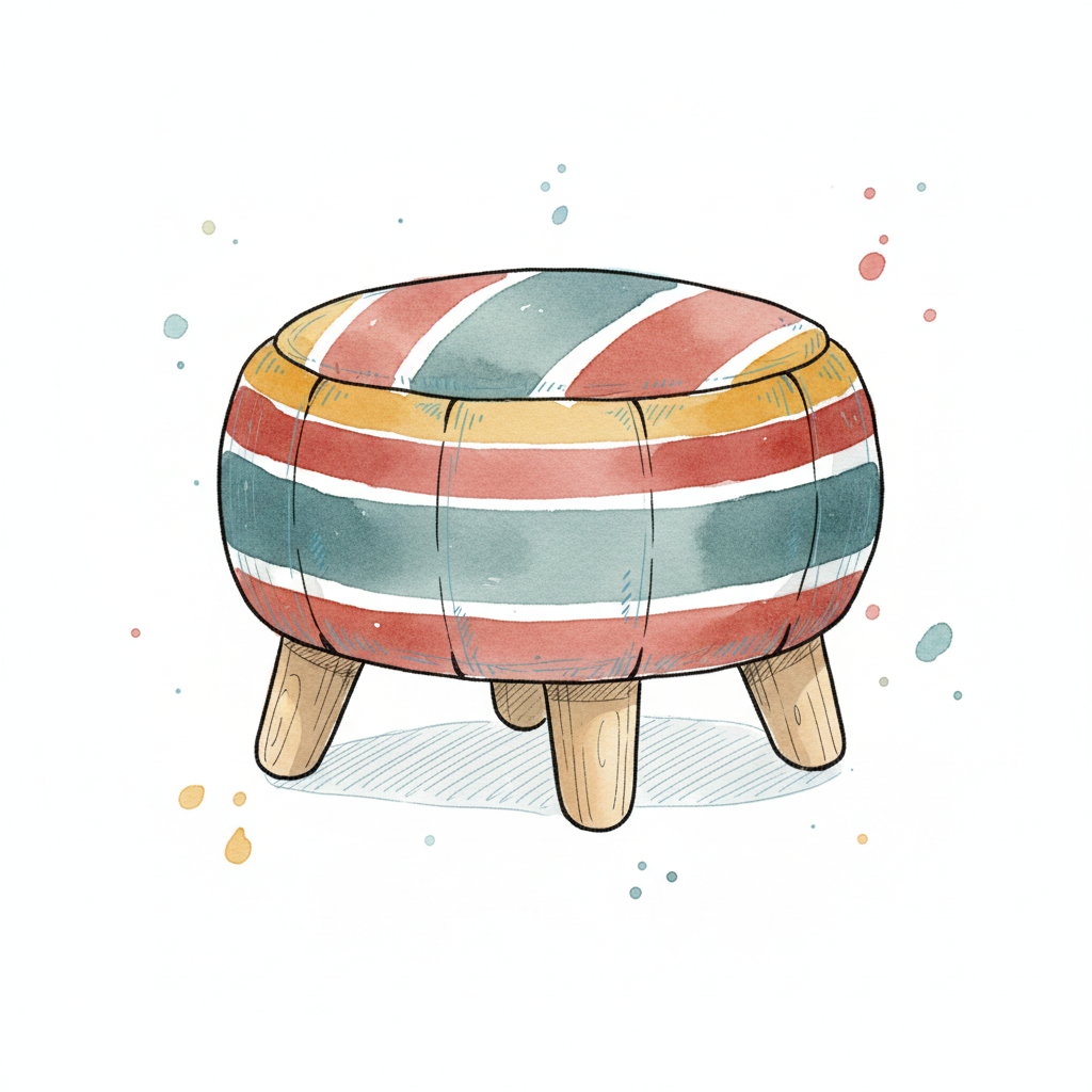 Aquarell-Illustration eines runden, gestreiften Hockers mit drei Holzbeinen.