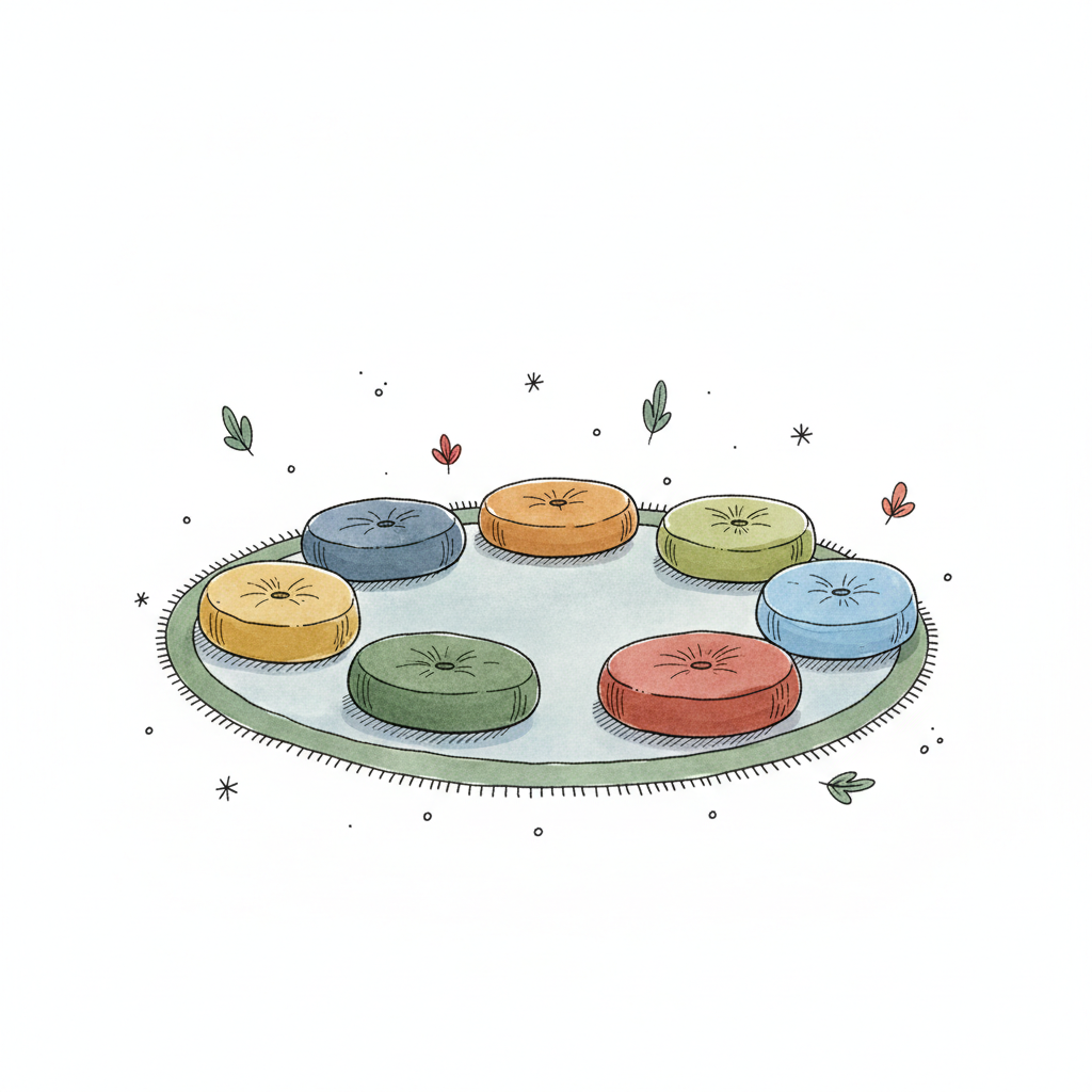 Aquarell-Illustration von sieben bunten, runden Kissen auf einem Teppich, umgeben von Blättern.