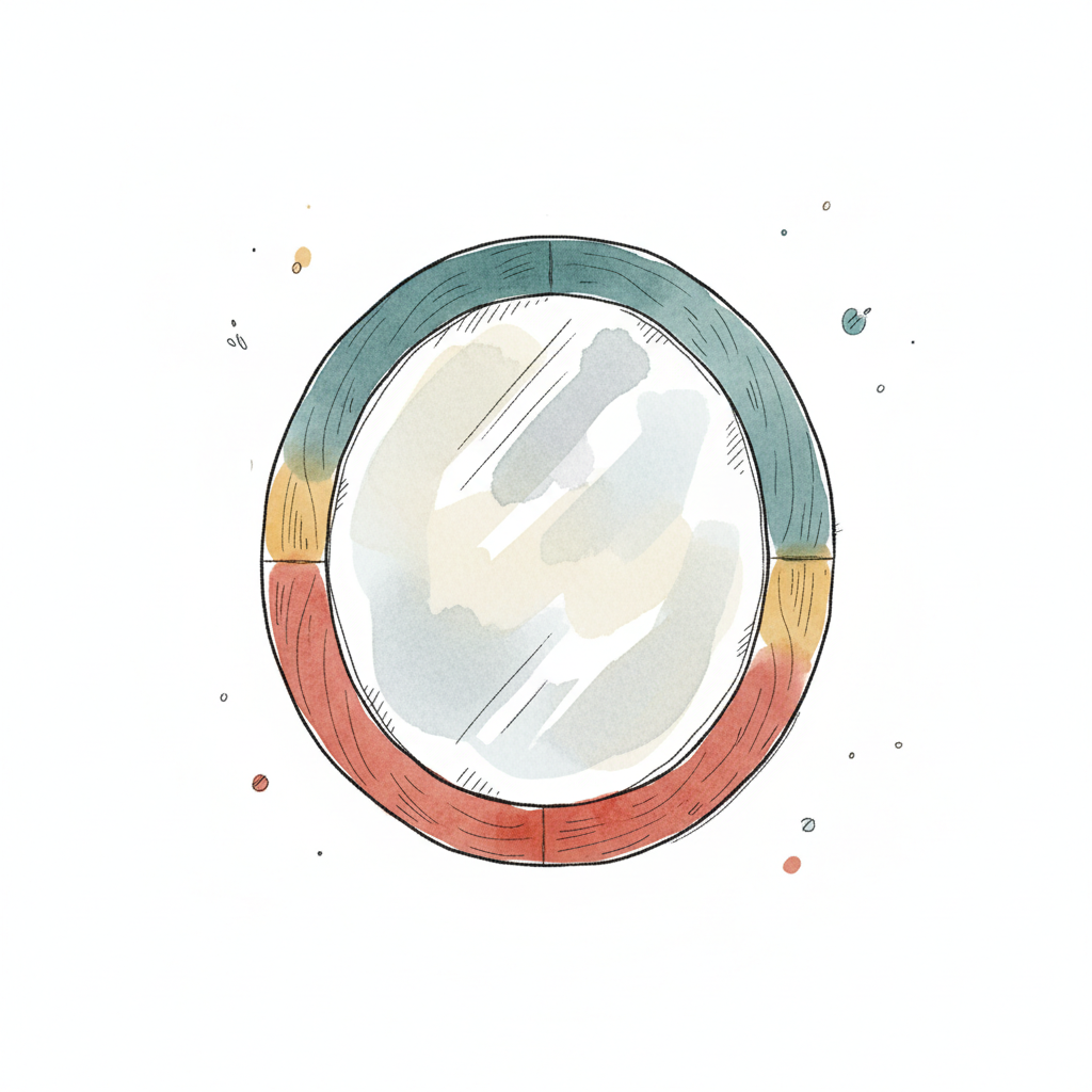 Aquarell-Illustration eines runden Spiegels mit mehrfarbigem Rahmen und skizzenhaftem Stil.