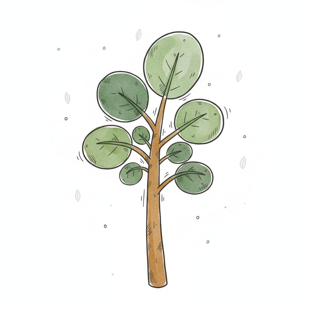 Handgezeichneter Baum mit runden, grünen Blättern und braunem Stamm auf weißem Hintergrund.