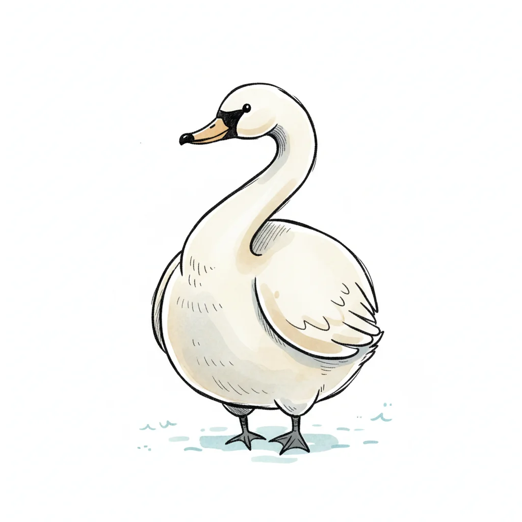 Eine niedliche, runde Illustration eines weißen Schwans auf weißem Hintergrund.