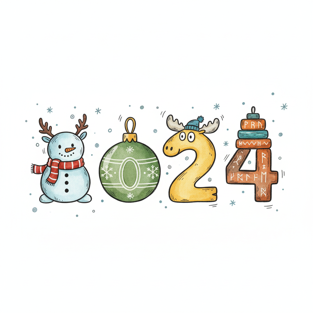 Niedliche Illustration von 2024 mit Schneemann, Weihnachtskugel, Elch und Runen-Turm.