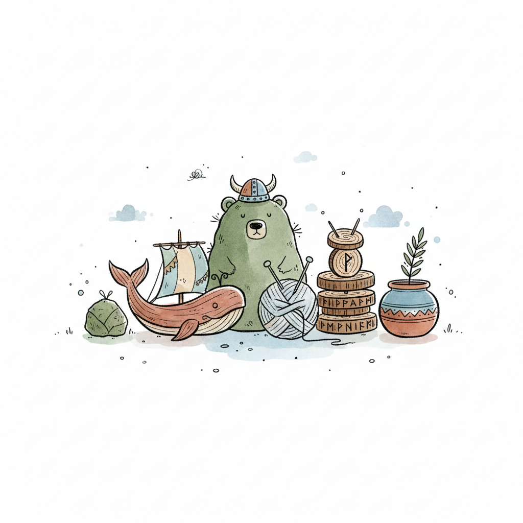 Niedliche Aquarell-Illustration: Wikinger-Bär, Wal mit Schiff, Wolle und Runen.