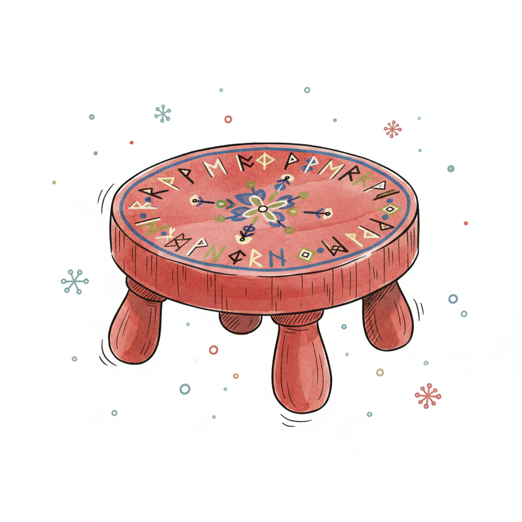 Roter Holzhocker mit Runen und Schneeflockenmuster, umgeben von kleinen Schneeflocken.