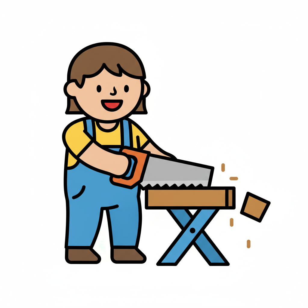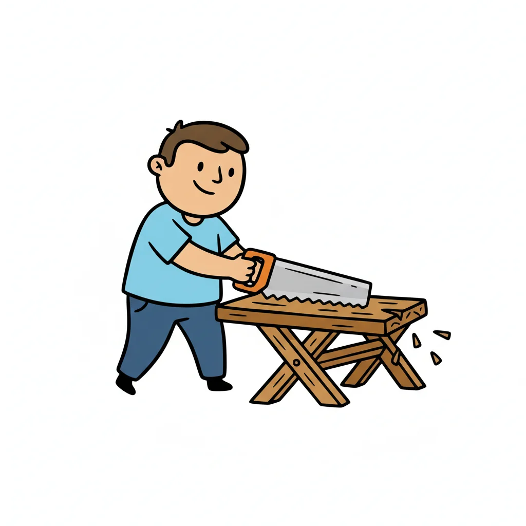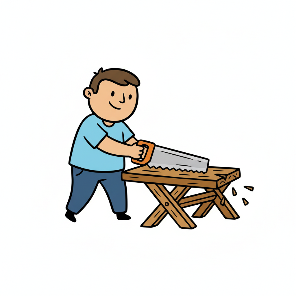 Ein Cartoon-Mann in Latzhose sägt einen Holzstamm auf einem Sägebock, Sägespäne fliegen.