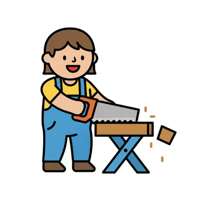 Fröhliche Cartoonfigur sägt Holz auf einem Sägebock, Holzspäne fliegen.