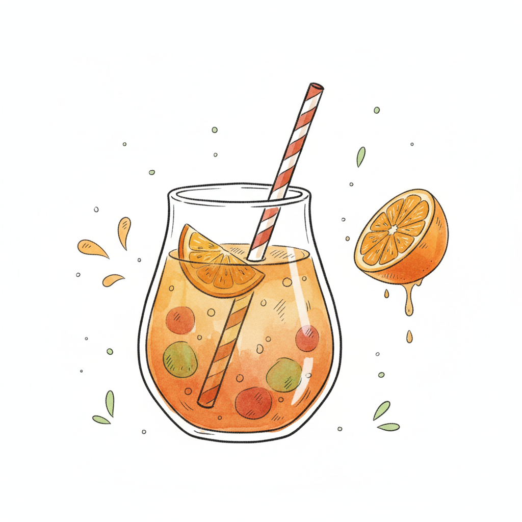 Ein Glas mit orangefarbener Flüssigkeit und einer Scheibe Orange.