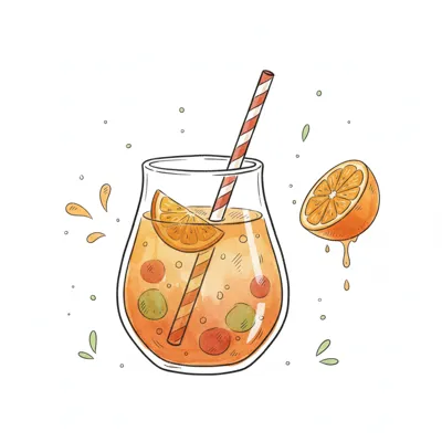 Buntes Getränk in einem Glas mit Früchten und einem Streifenhalm.