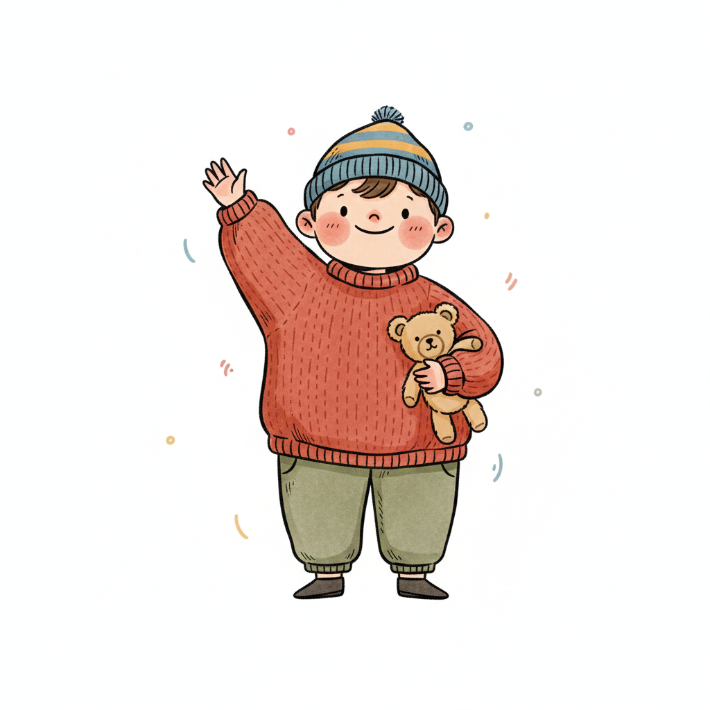 Ein fröhlicher Junge mit kurzen Haaren winkt und lächelt.