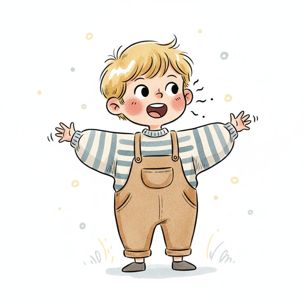 Ein fröhlicher Junge in Latzhose zeigt seine Freude mit offenen Armen.