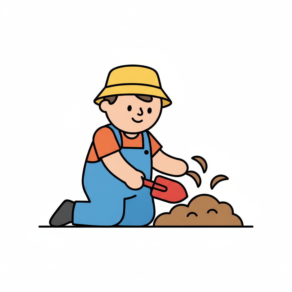 Cartoonfigur kniet und pflanzt Samen mit einer Schaufel in die Erde.