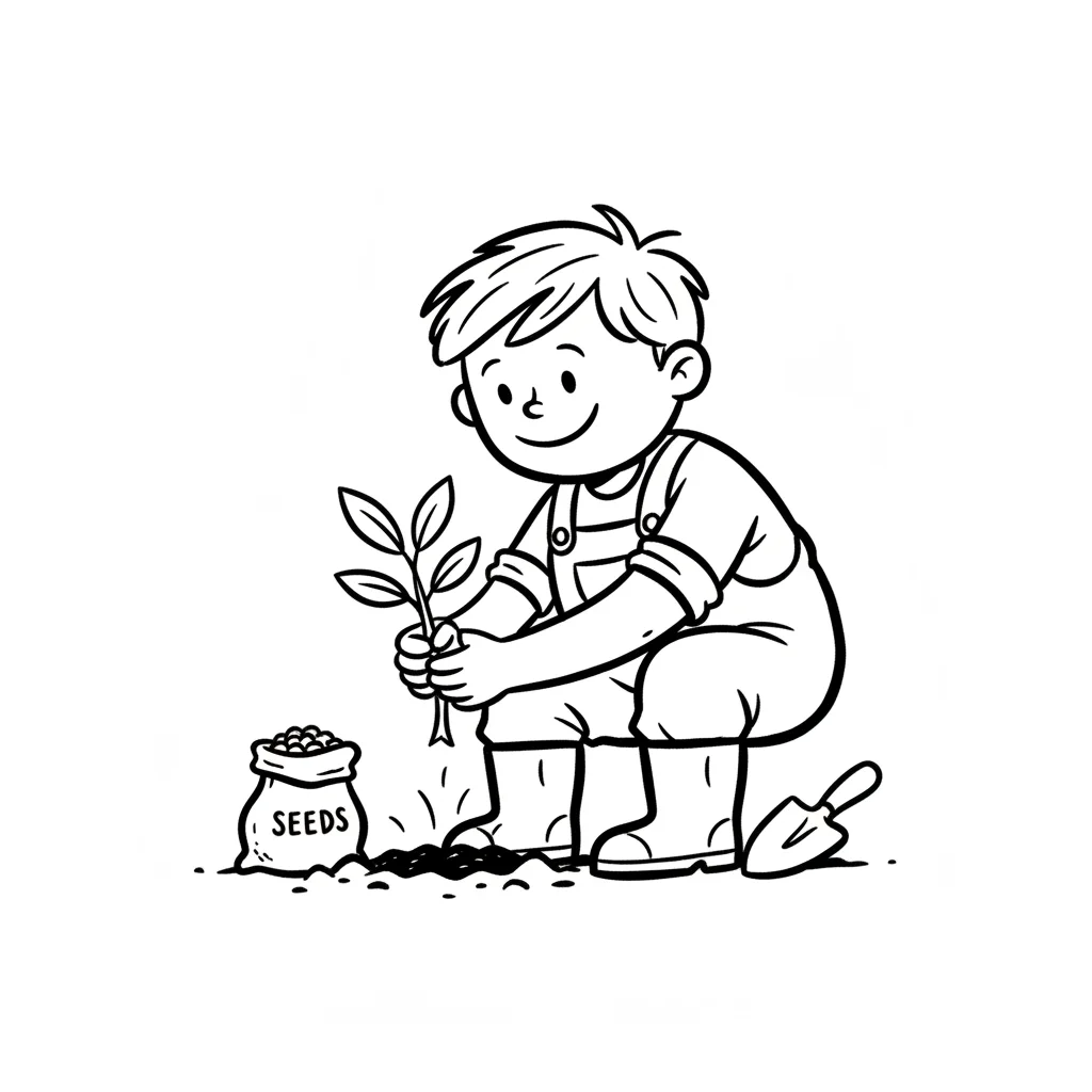 Ein lächelnder Cartoon-Junge kniet und pflanzt einen Samen neben einem jungen Trieb.