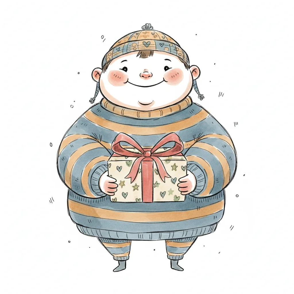 Ein fröhliches Kind in gestreiftem Pullover hält ein Geschenk.