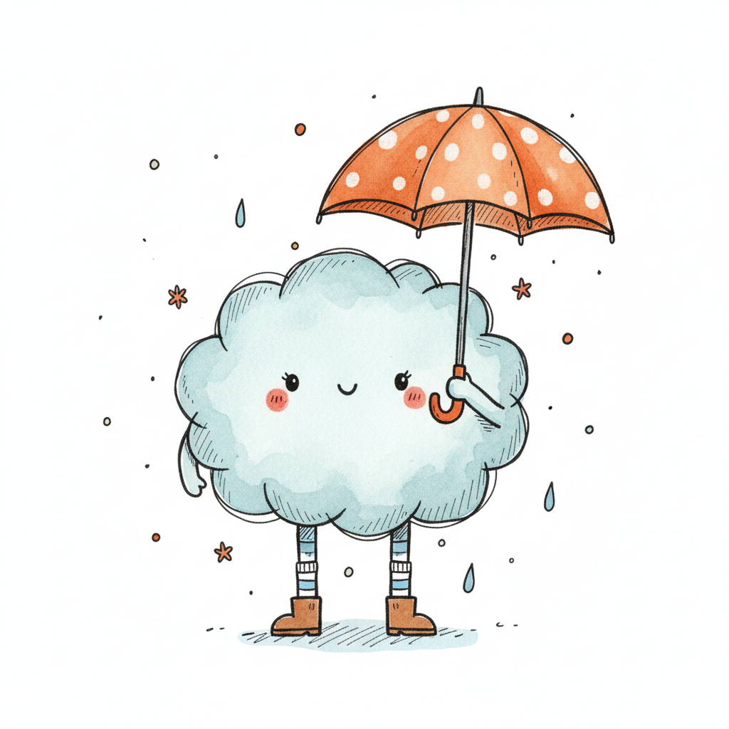 Fröhliche Cartoon-Wolke mit Gesicht, Beinen, Stiefeln und einem gepunkteten Regenschirm im Regen.