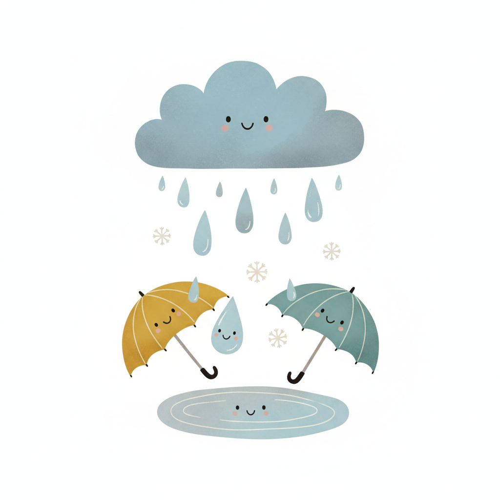 Niedliche Wolke regnet auf zwei lächelnde Regenschirme, Regentropfen und Pfütze. Schneeflocken fliegen.