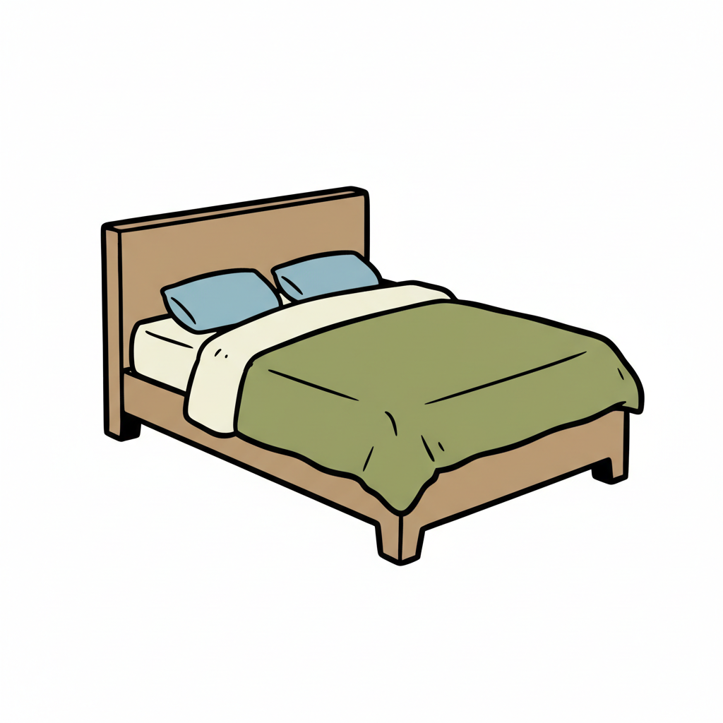 Ein schlichtes Doppelbett mit grüner Decke und zwei Kissen.