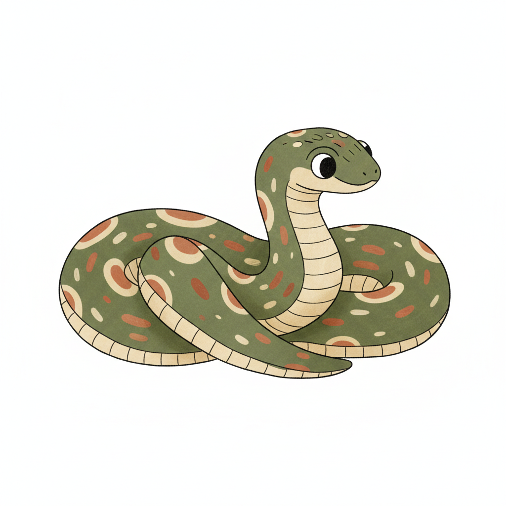 Eine bunte, cartoonhafte Schlange mit freundlichem Gesicht.