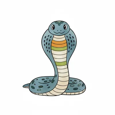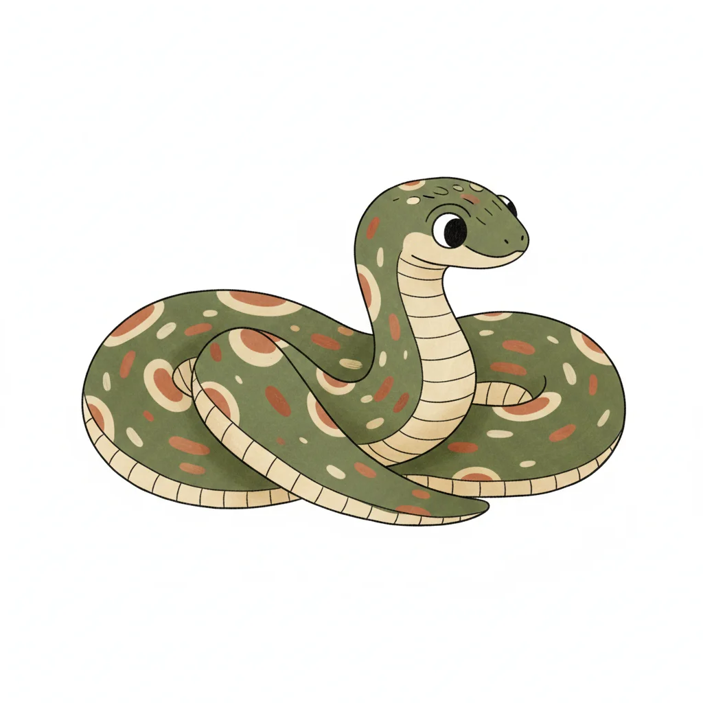 Eine cartoonartige Schlange mit bunten Mustern und freundlichem Gesicht.