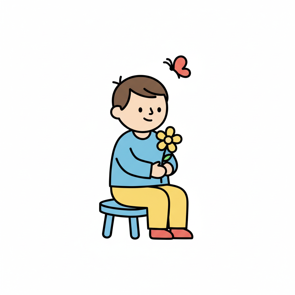 Ein Junge sitzt auf einem Stuhl und hält eine Blume, während ein Schmetterling fliegt.