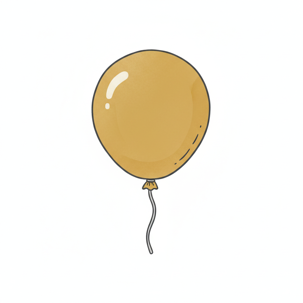 Ein einzelner, goldener Ballon mit Schnur, gezeichnet im Cartoon-Stil auf weißem Hintergrund.