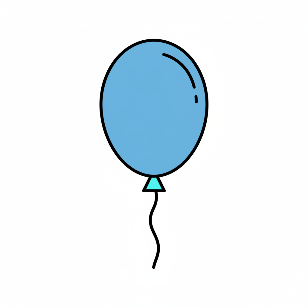 Eine einfache Illustration eines hellblauen Ballons mit schwarzer Umrandung und Schnur auf weißem Hintergrund.