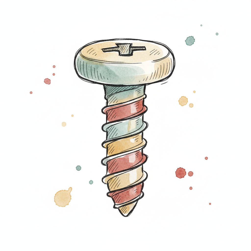 Bunte Schraube im Aquarell-Stil mit Farbspritzern auf weißem Hintergrund.