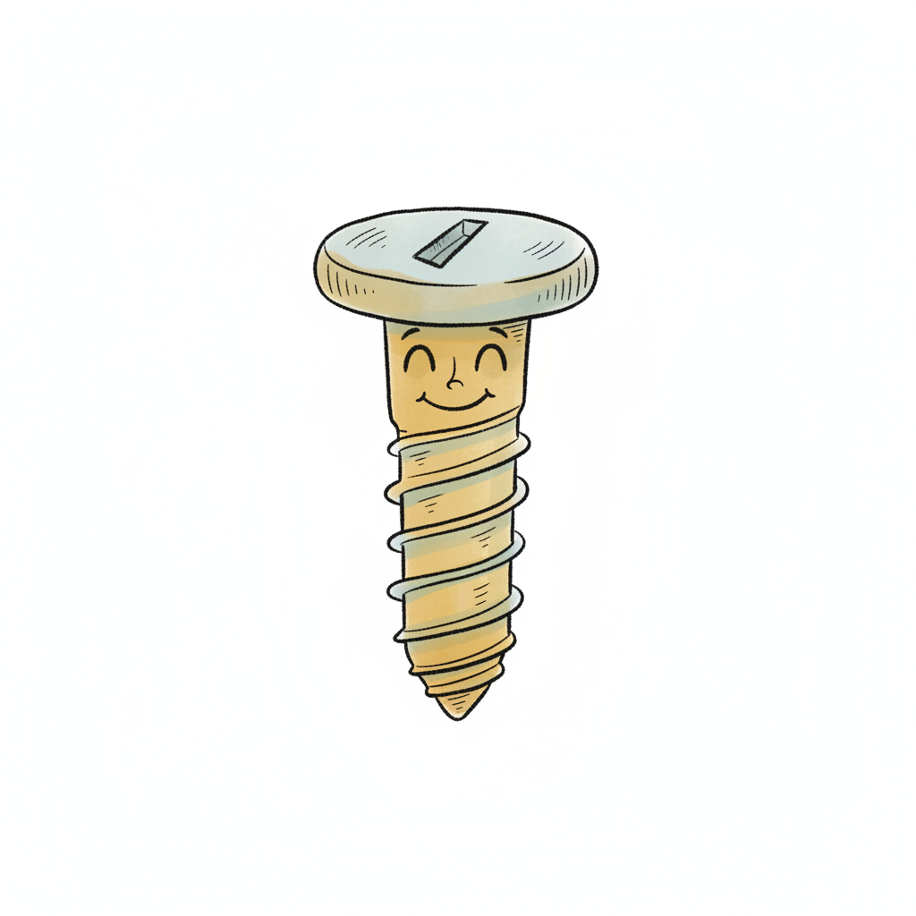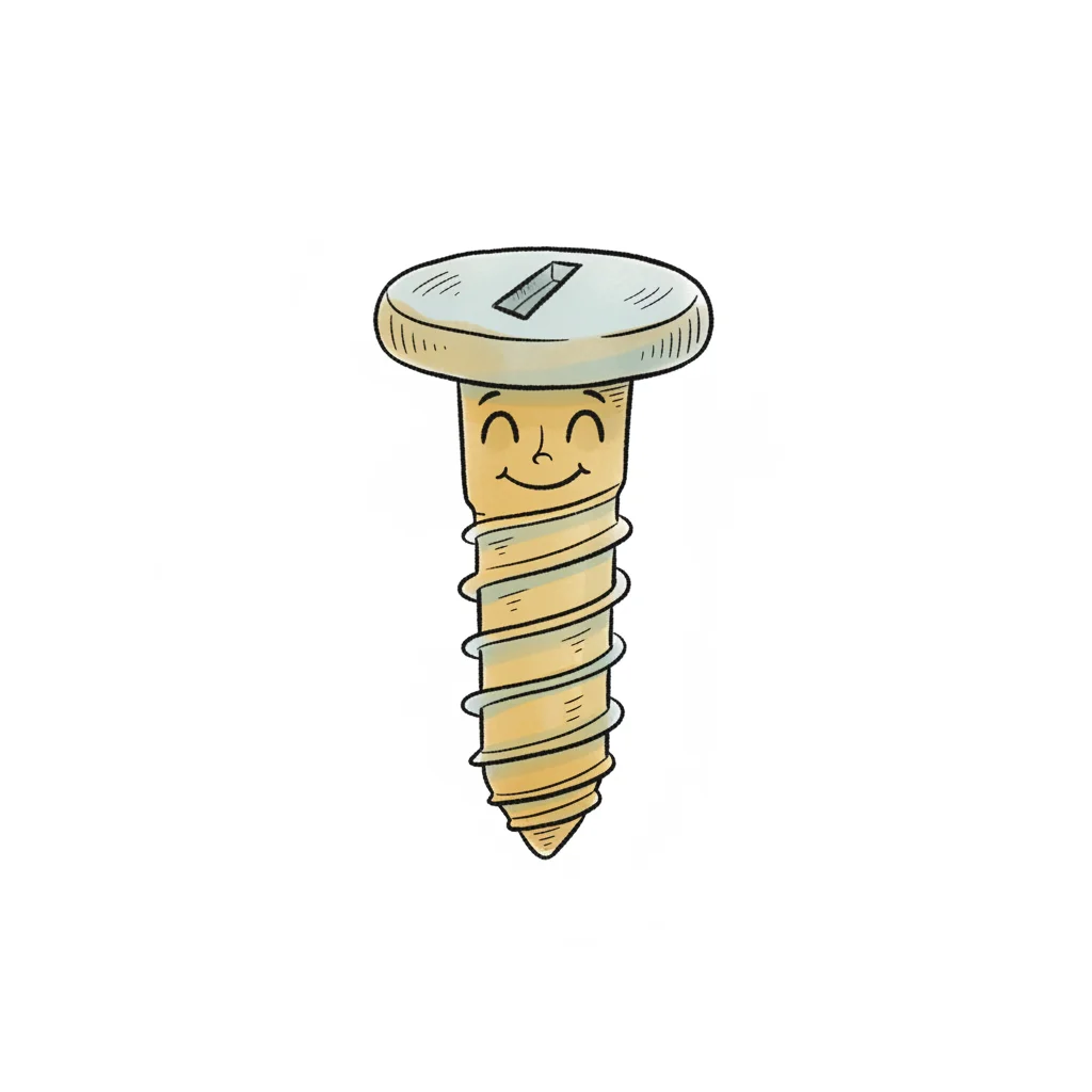 Fröhliche Cartoon-Schraube mit Gesicht auf weißem Hintergrund.