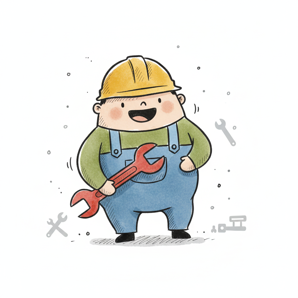 Fröhlicher Cartoon-Arbeiter mit gelbem Helm und rotem Schraubenschlüssel in blauer Latzhose.