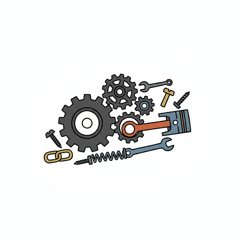 Illustration von Zahnrädern, Kolben, Schrauben und Werkzeugen, die Mechanik und Technik symbolisieren.