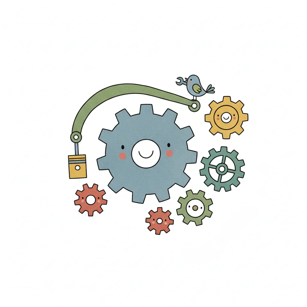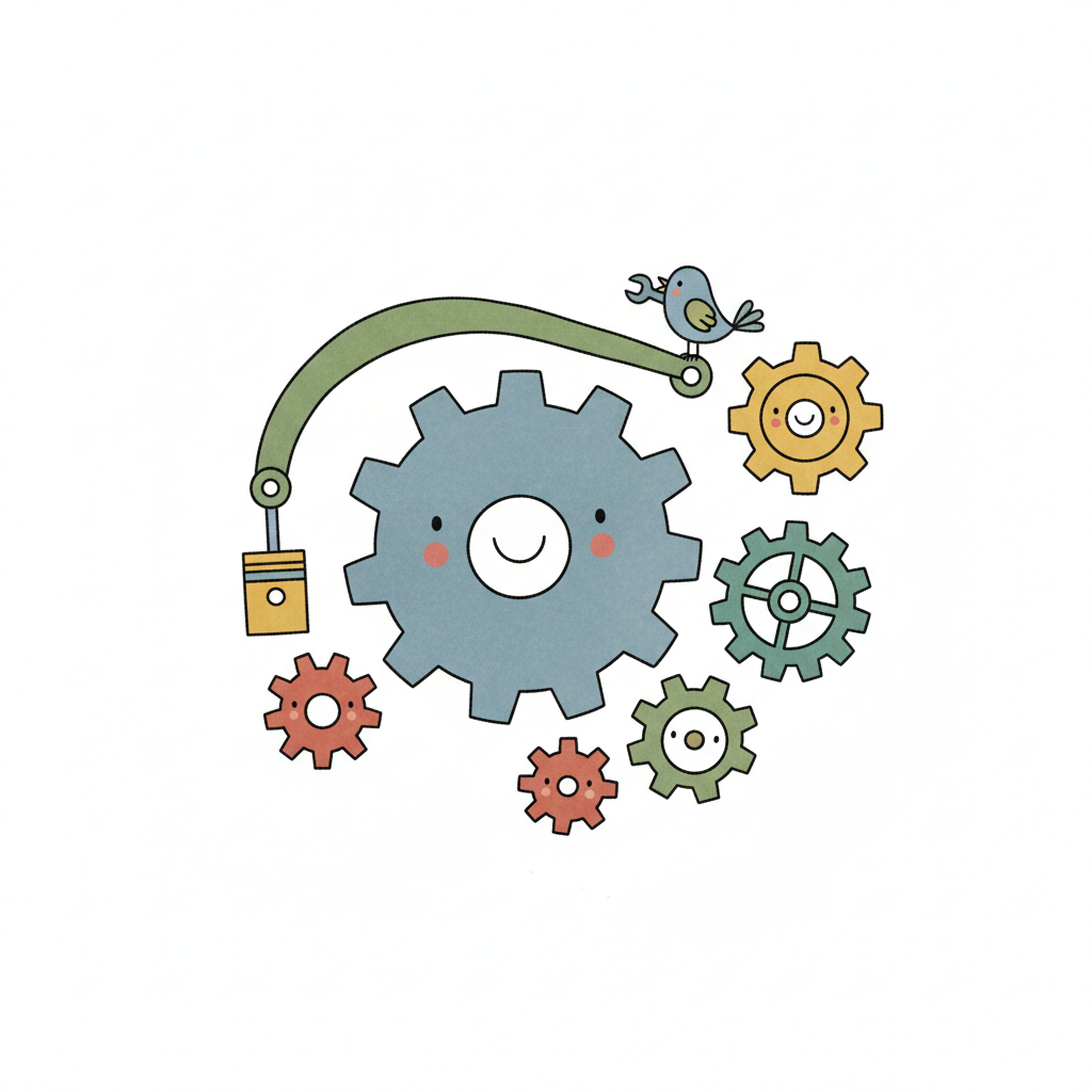Niedliche Cartoon-Zahnräder mit Gesichtern, einem Vogel mit Schraubenschlüssel und einem Kolben.