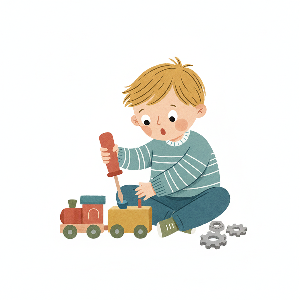 Ein kleiner Junge schraubt konzentriert an einem Holzspielzeugzug. Zahnräder liegen daneben.
