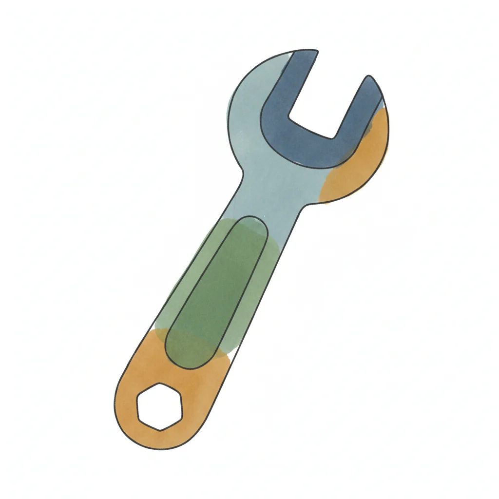 Eine stilisierte, bunte Schraubenschlüssel-Illustration mit Aquarell-Textur auf weißem Hintergrund.