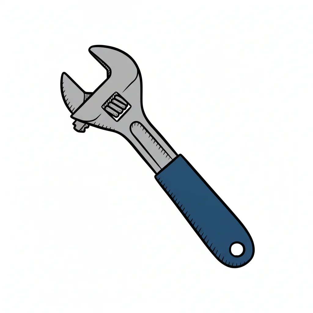 Zeichnung eines grauen Rollgabelschlüssels mit blauem Griff auf weißem Hintergrund.