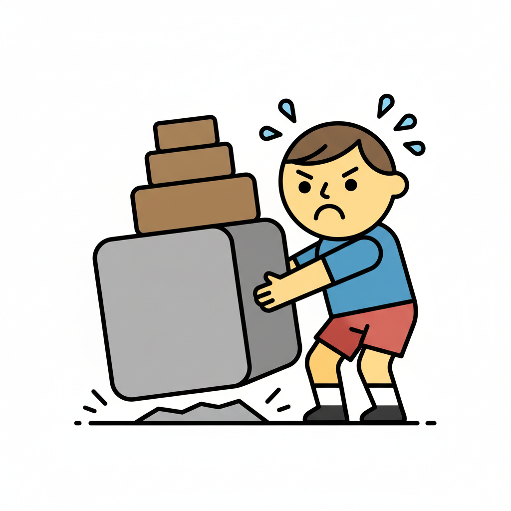 Ein Cartoon-Junge schiebt mit großer Anstrengung einen riesigen Stein. Er schwitzt und kämpft.
