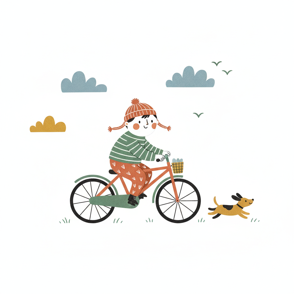 Ein Kind fährt Fahrrad, begleitet von einem Hund. Am Himmel sind Wolken und Vögel zu sehen.