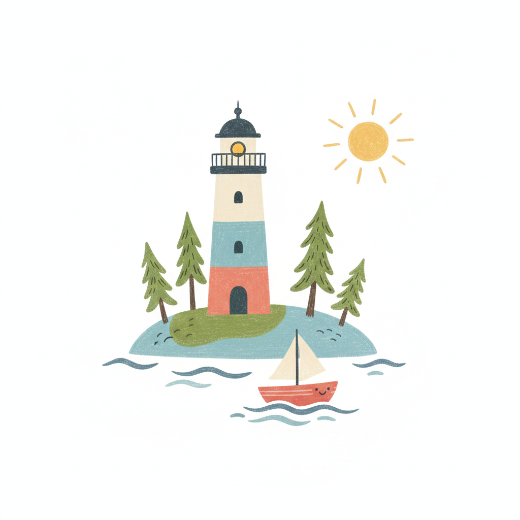 Fröhliche Cartoon-Illustration: Leuchtturm auf Insel mit Bäumen, lächelndes Segelboot, Sonne.