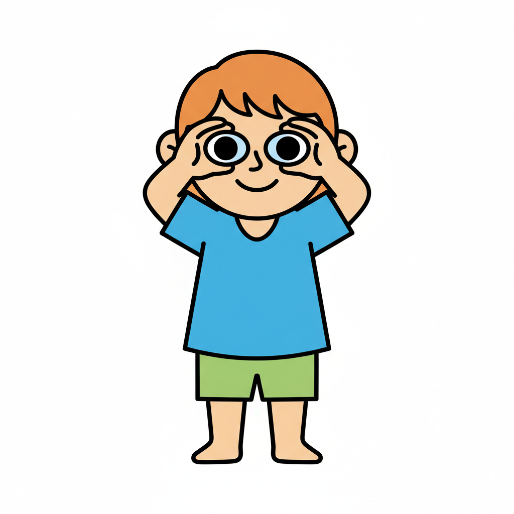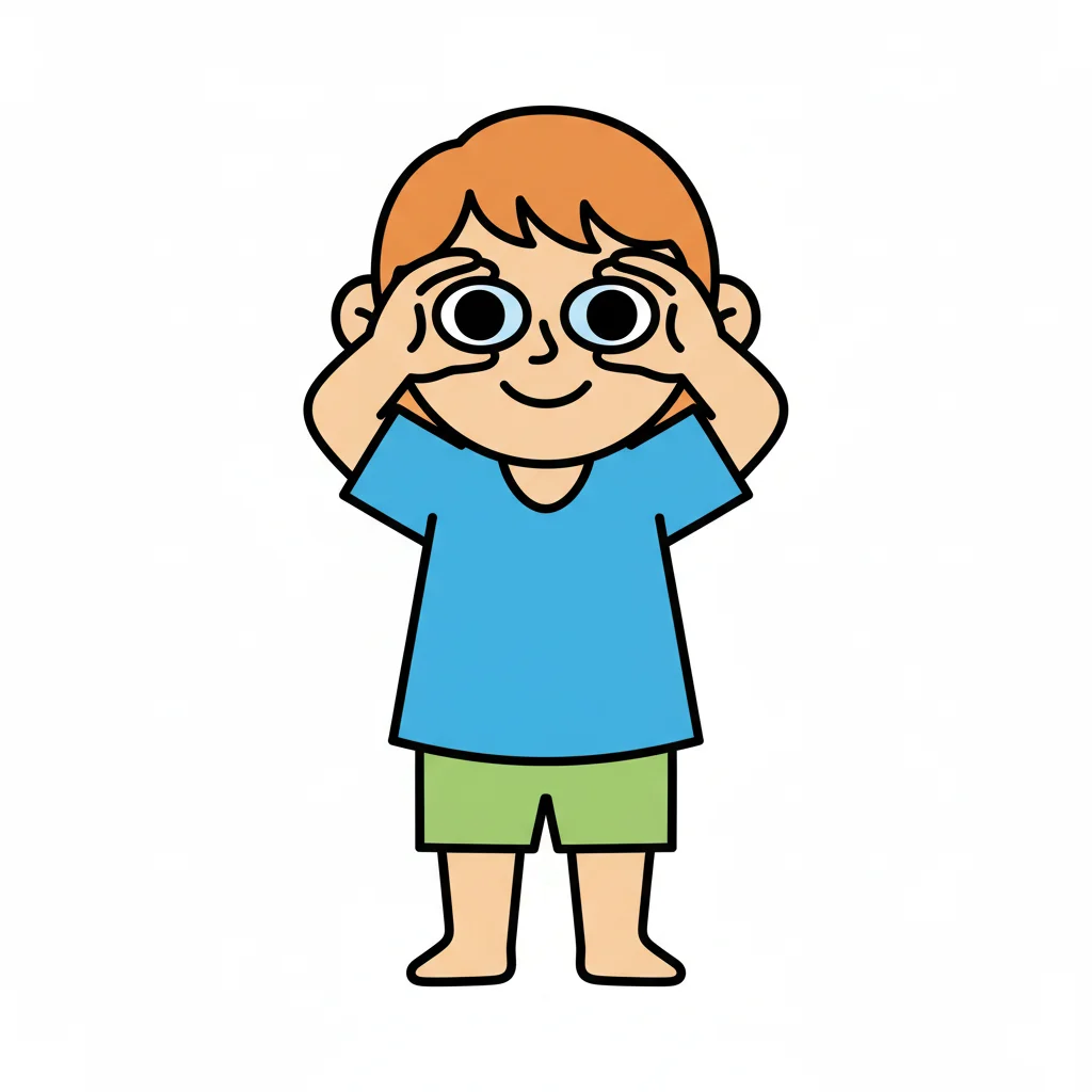 Ein lächelndes Cartoon-Kind schaut durch die Hände, als ob es ein Fernglas benutzt.
