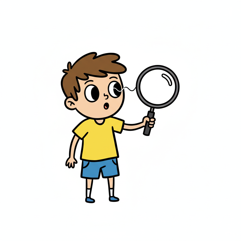 Ein Cartoon-Junge schaut neugierig durch eine Lupe, sein Auge ist vergrößert.