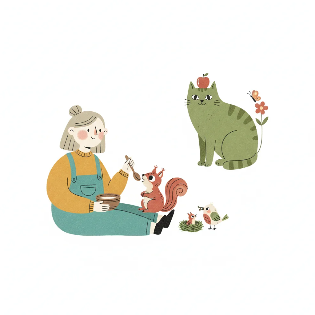 Mädchen füttert Eichhörnchen, während eine Katze mit Apfel und Vögel zusehen. Freundliche Szene.