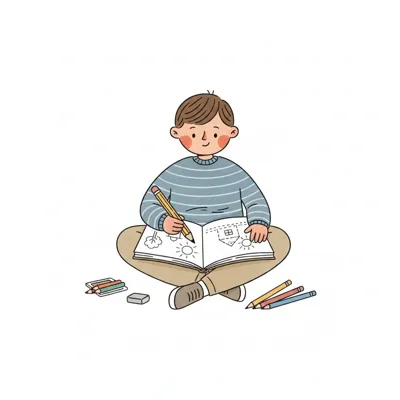 Ein Junge sitzt und zeichnet mit Bleistift in ein Skizzenbuch; Sonne, Bäume und ein Haus sind zu sehen.