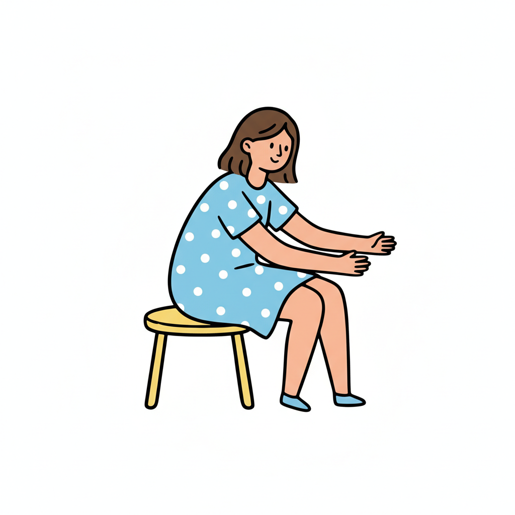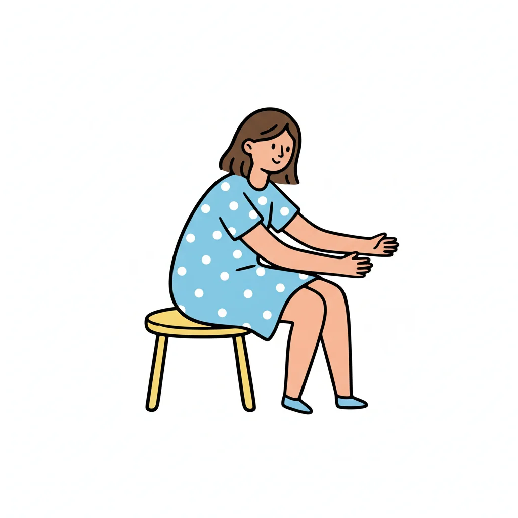 Cartoon Frau im gepunkteten Kleid sitzt auf Hocker, Arme ausgestreckt, lächelnd.