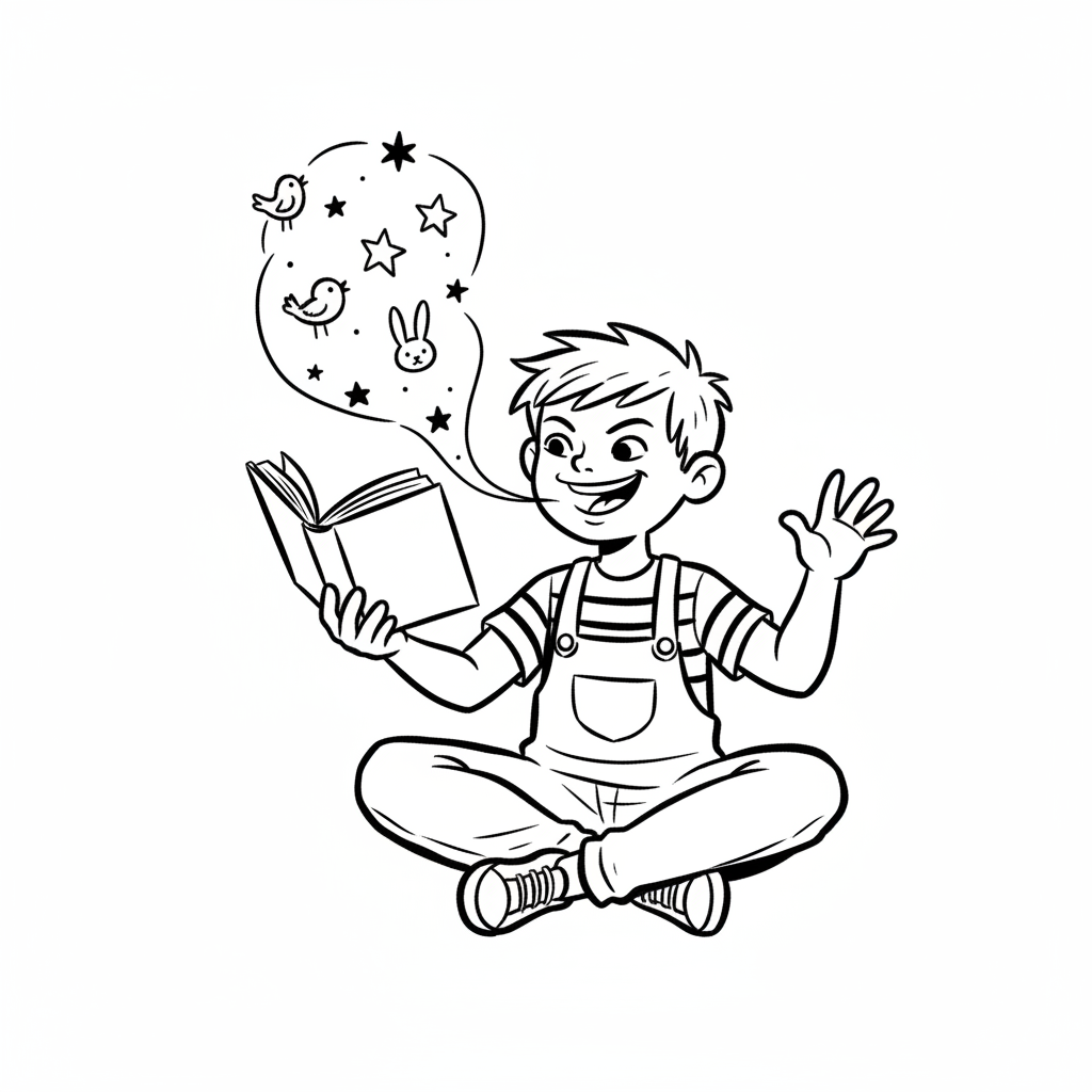 Ein Junge sitzt und liest begeistert ein Buch mit Fantasiebildern.